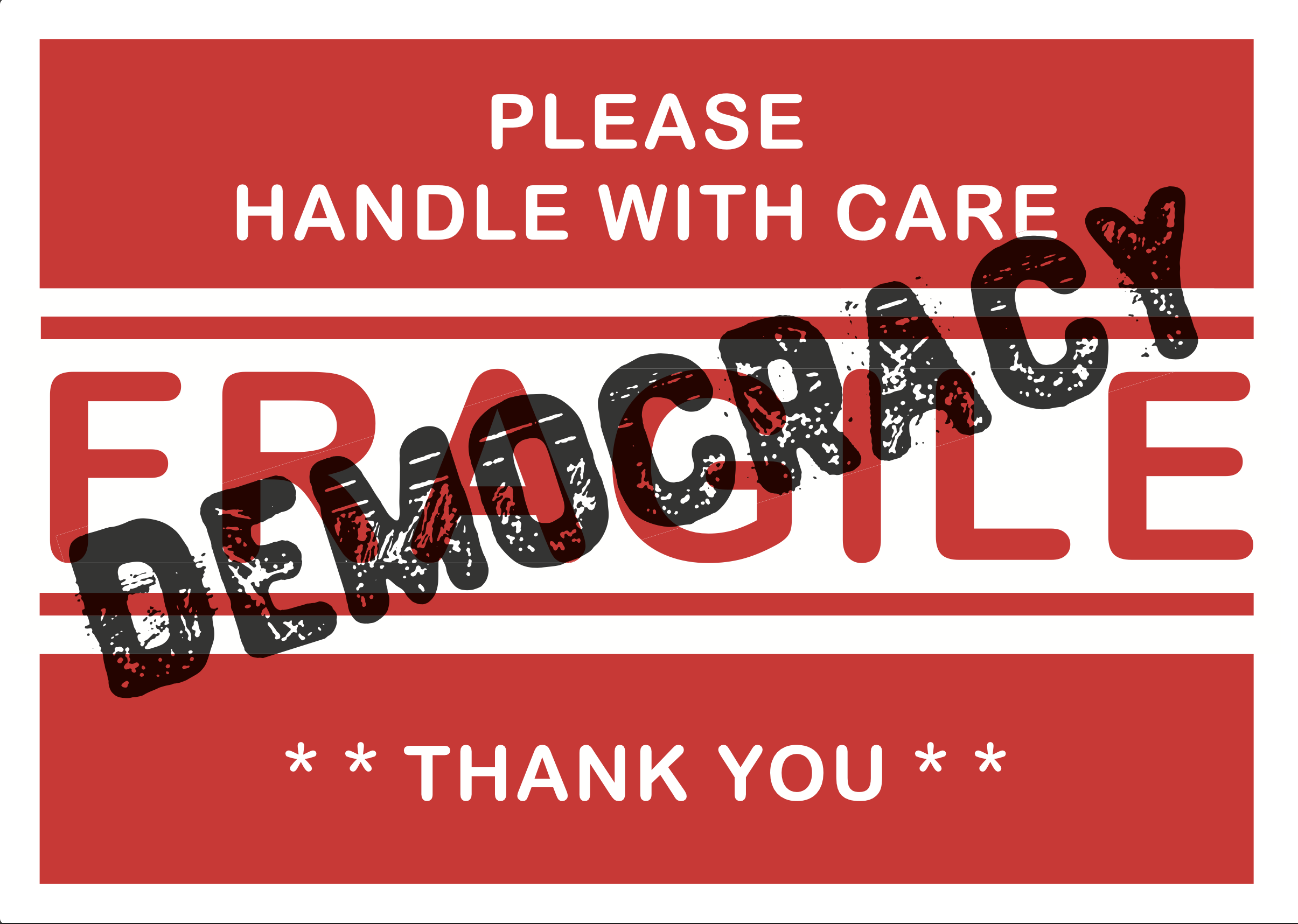 Auf einen bereits bestehenden Post-Aufkleber für zerbrechliches Gut wurde das Wort „Democracy“ oder „Demokratie“ aufgedruckt. Der Sticker wurde ein Jahr lang vielfach auf Briefe und Pakete, aber auch an anderen interessanten Stellen verklebt und verteilt.