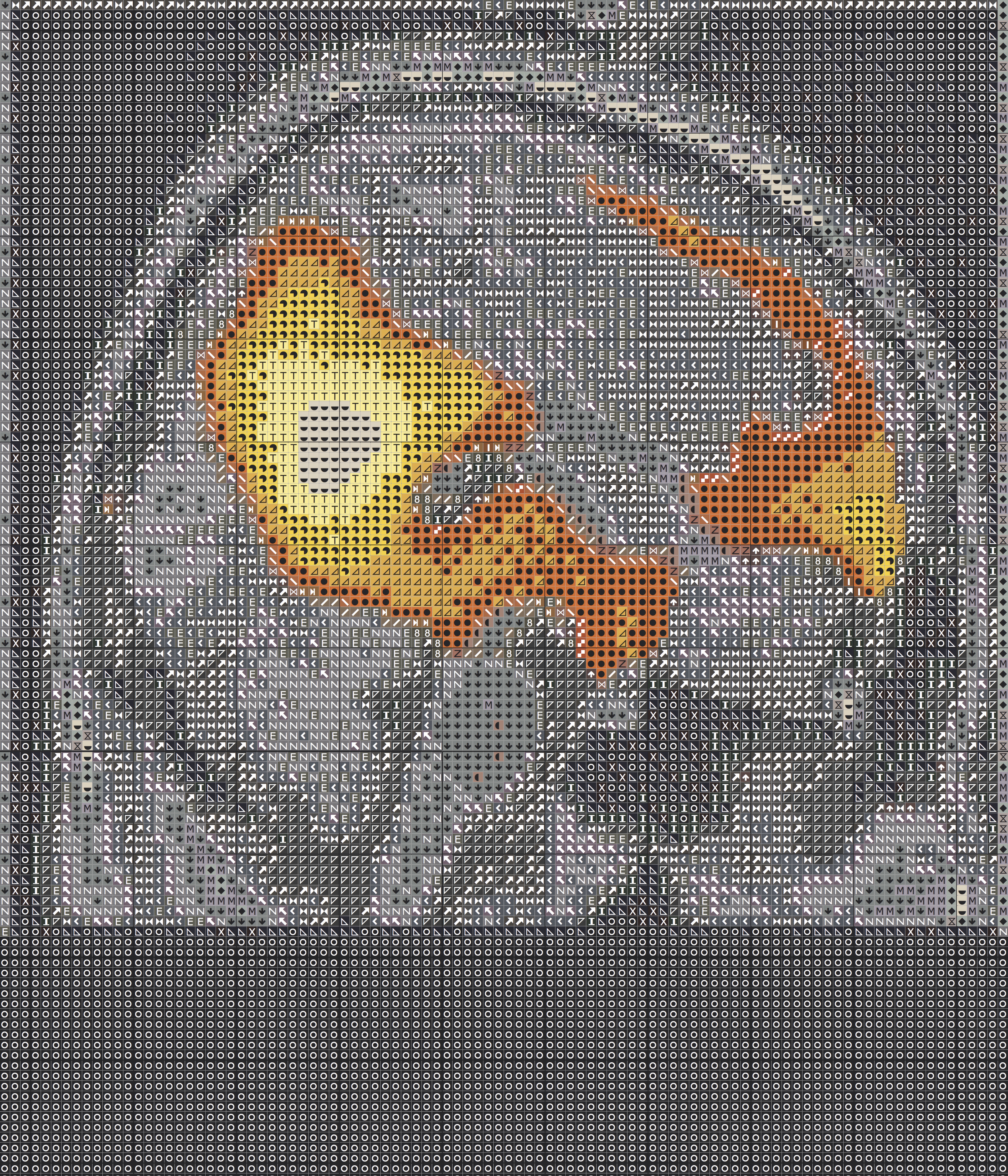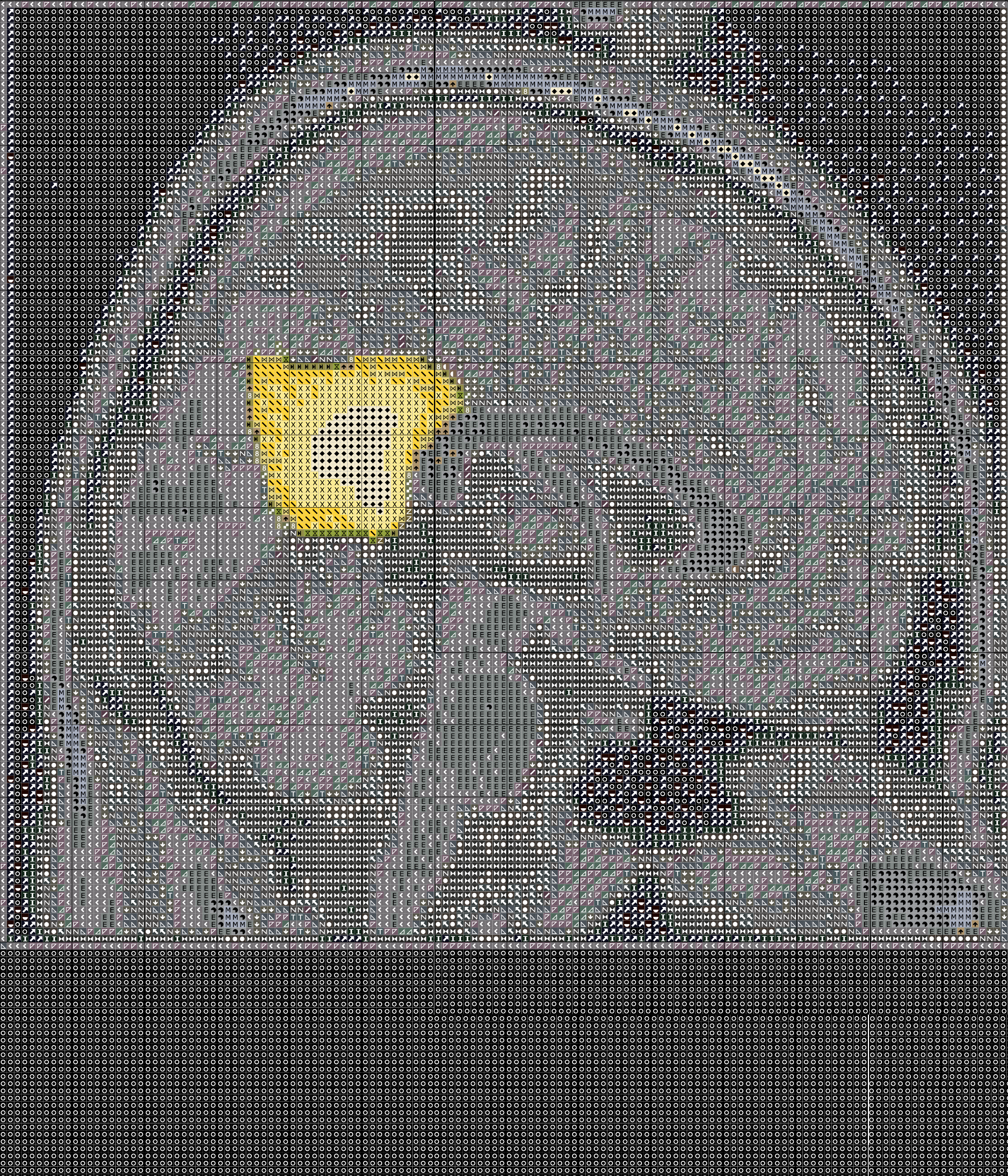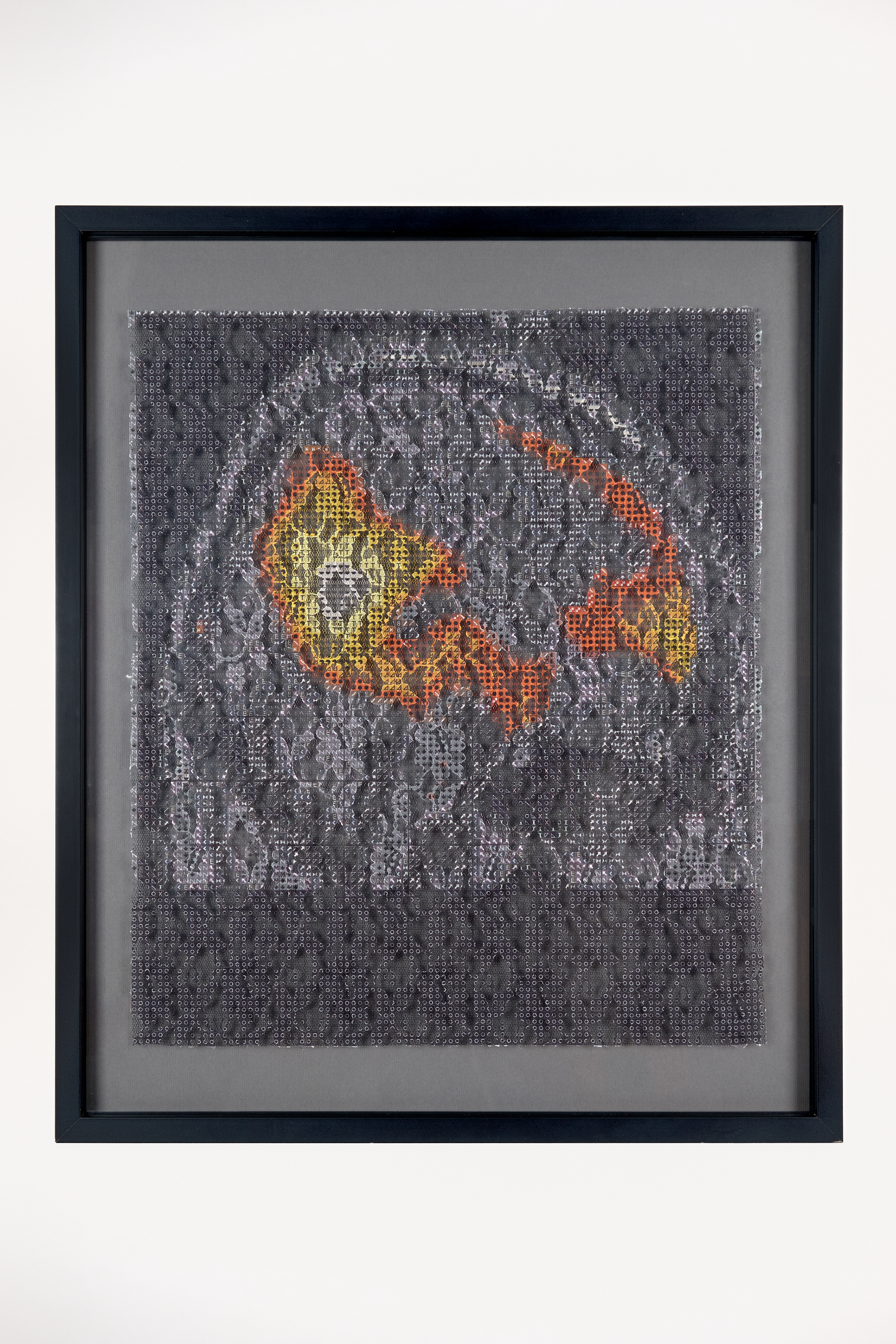 Die beiden Gehirnscans sind mit einem Stickmuster überzogen und auf Spitze gedruckt. Jedes Symbol steht dabei für eine Farbe. Die Hieroglyphen und das feine Gewebe, welche die Scans durch- und überziehen, sind ein Hinweis, dass wir alle aus den gleichen Grundfarben gemacht und vom gleichen feinen Grundstoff durchwirkt sind. Durch die Neuroplastizität des Gehirns und unsere biografischen Erfahrungen entstehen Formationen und Strukturen, durch die wir die Welt betrachten. Wer sind wir? Die neuronale Formation des Augenblicks oder ein feines, schwebendes Geflecht von Grundfarben, das die Dinge durchzieht?