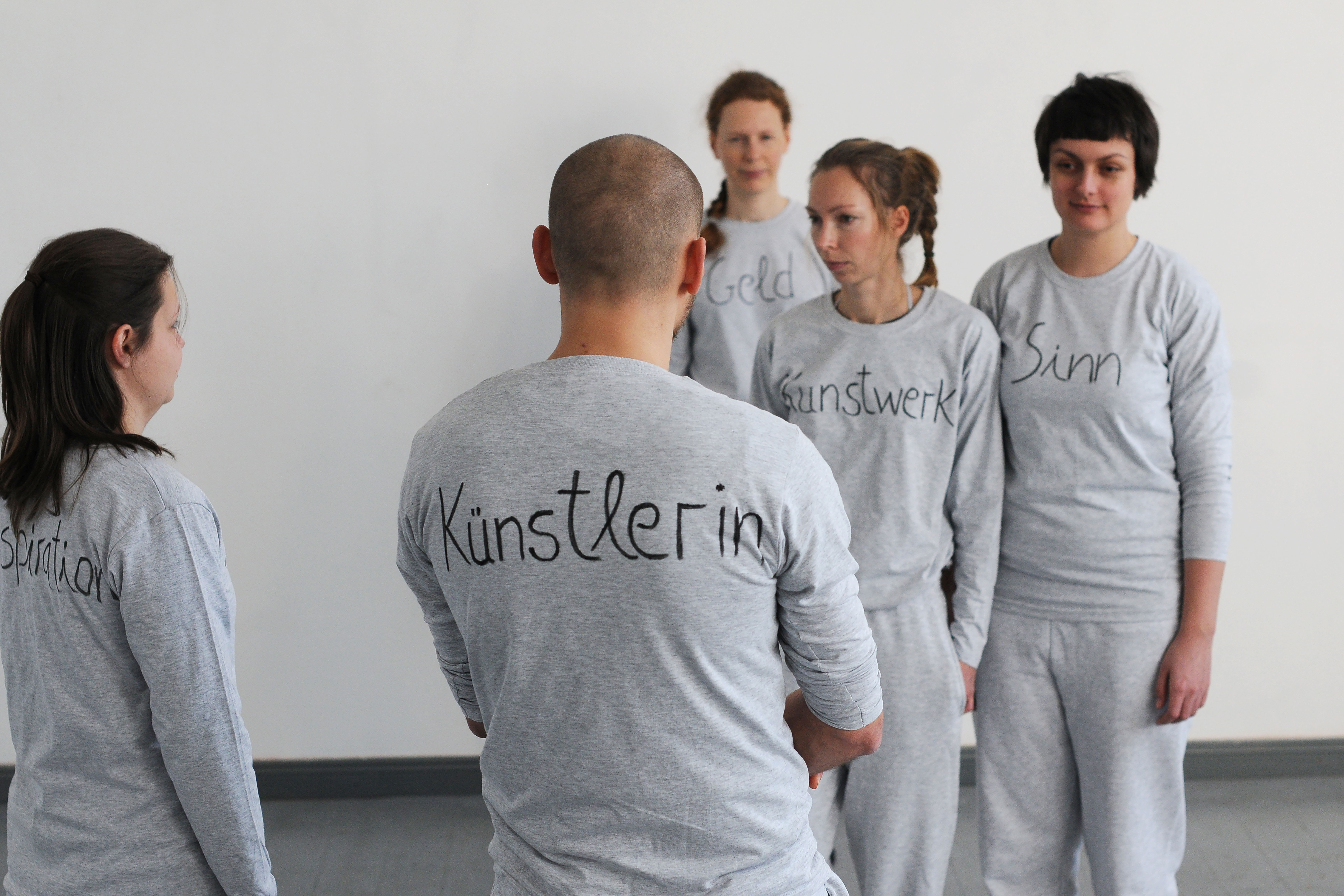 Die prototypische Aufstellung mit dem Fokus “Wie kann ich als freie*r Künstler*in finanziell überleben?” behandelt - im Gegensatz z.B. zu Familienaufstellungen - nicht eine individuelle, sondern eine allgemeine Fragestellung, die viele Künstler*innen betrifft. 16 Personen überlegten gemeinsam mit einem professionellen Aufsteller, welche Repräsentanten*innen nötig sind, um die Frage darzustellen. Jede Person wählte eine*n Repräsentanten*in und zog einen beschrifteten Anzug an.