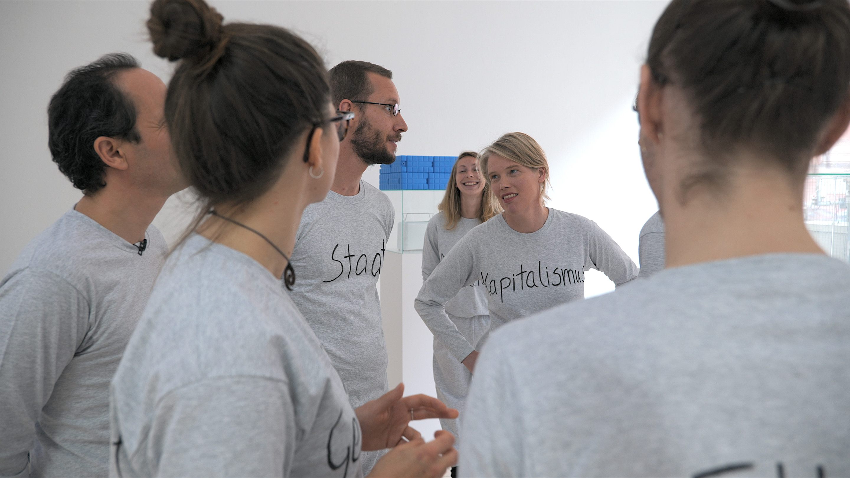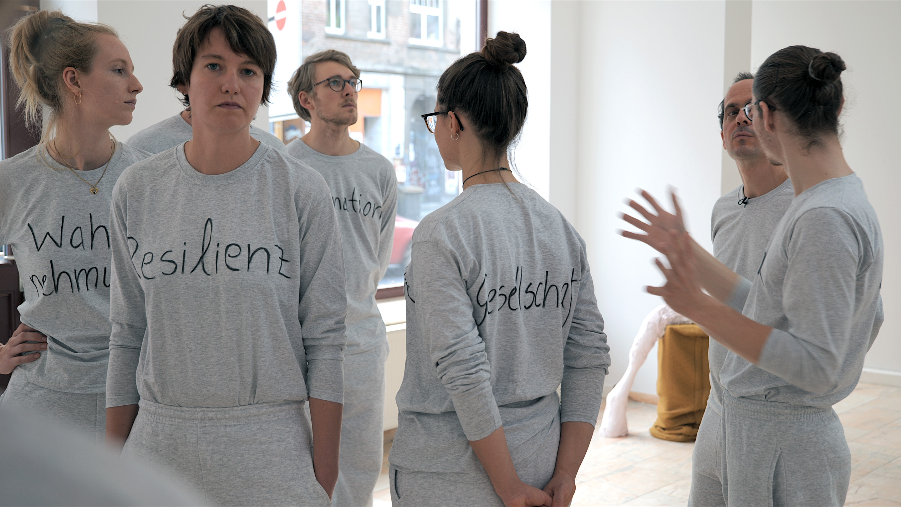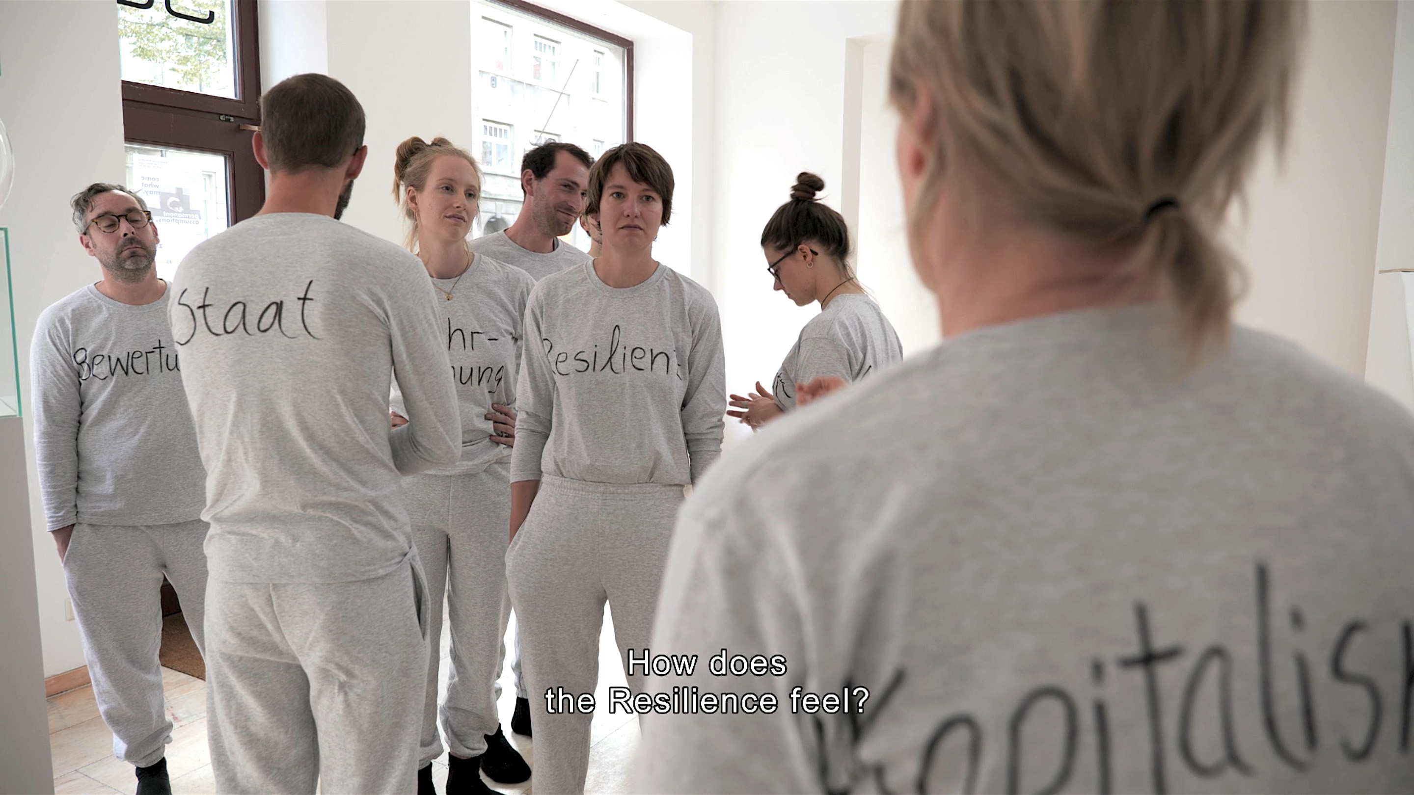 Passend zum Ausstellungsthema „Resilienz“ stellten wir Fragen zur Rolle von Resilienz in neoliberalen Zeiten. Die prototypische Systemaufstellung – ursprünglich ein Coaching-Instrument – eignet sich auch hervorragend als kuratorisches Instrument: Sie kann die Sicht auf das Thema bereichern oder vertiefen oder Texte für Publikationen inspirieren. Wenn Kurator*innen und Künstler*innen teilnehmen, kann sie einen direkten Bezugsrahmen für eine Ausstellung schaffen. Sie ist ein verbindendes und humorvolles Gruppenerlebnis und das surreale Setting fördert die Kreativität auf unerwartete Weise.