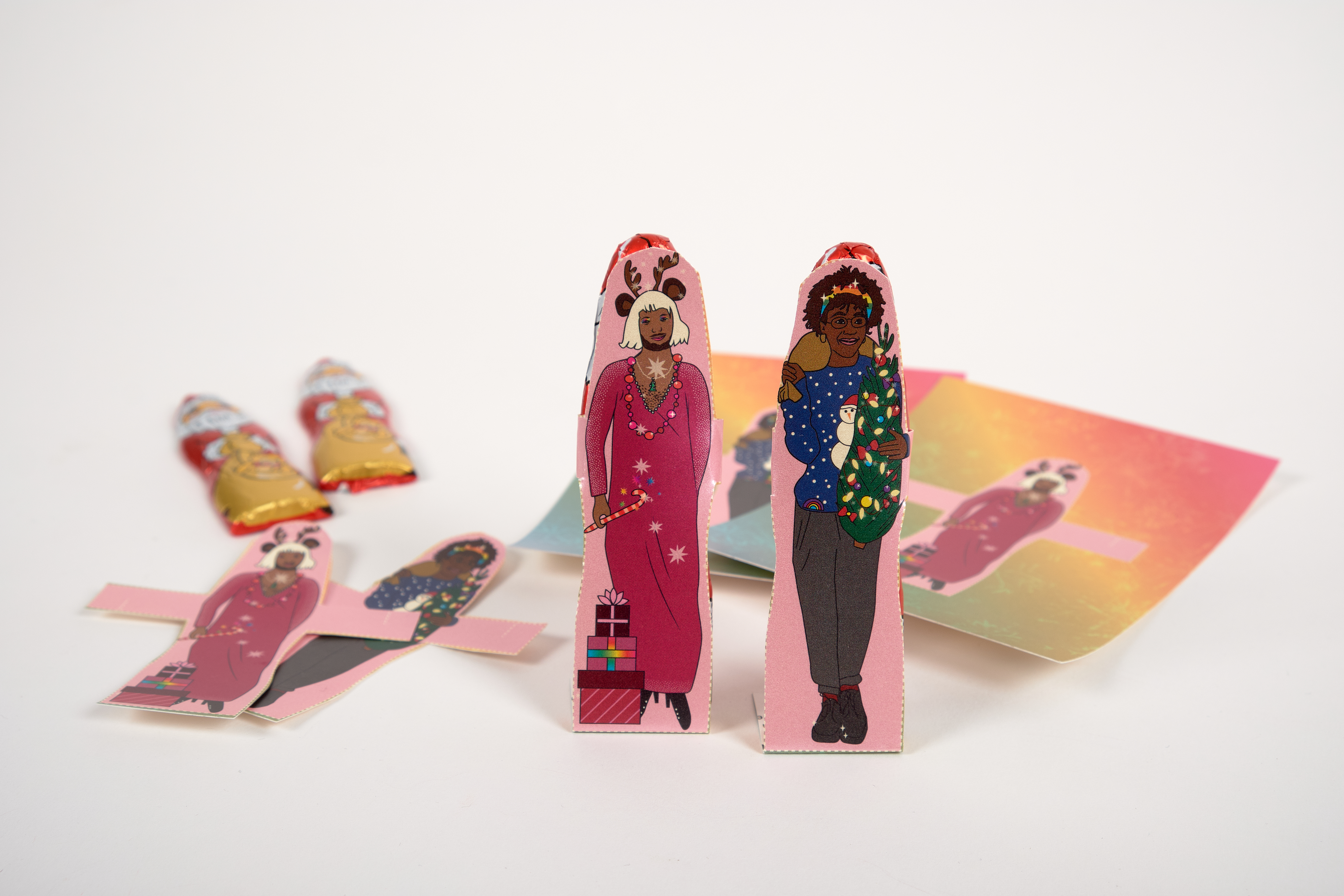 Enjoy a queer Christmas - Geschenkset für ein diverses Weihnachten: Queering Christmas ist ein Geschenkset mit 3 Postkarten und zwei Schokoladenweihnachtsmännern. Auf zwei Postkarten können queere Personen ausgeschnitten und mit Hilfe von Papierlaschen vor den beiden weißen, alten Schokoweihnachtsmännern platziert werden.