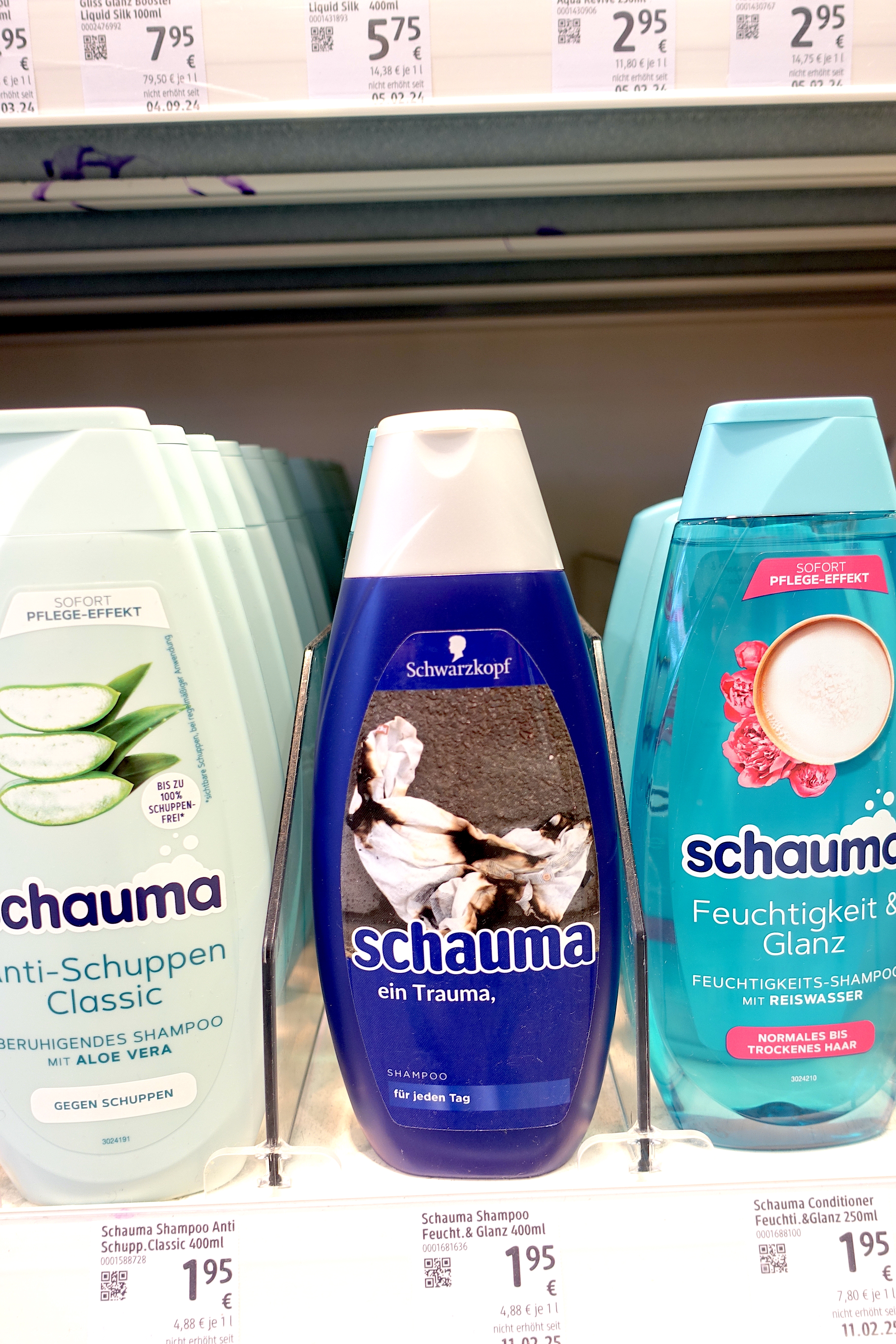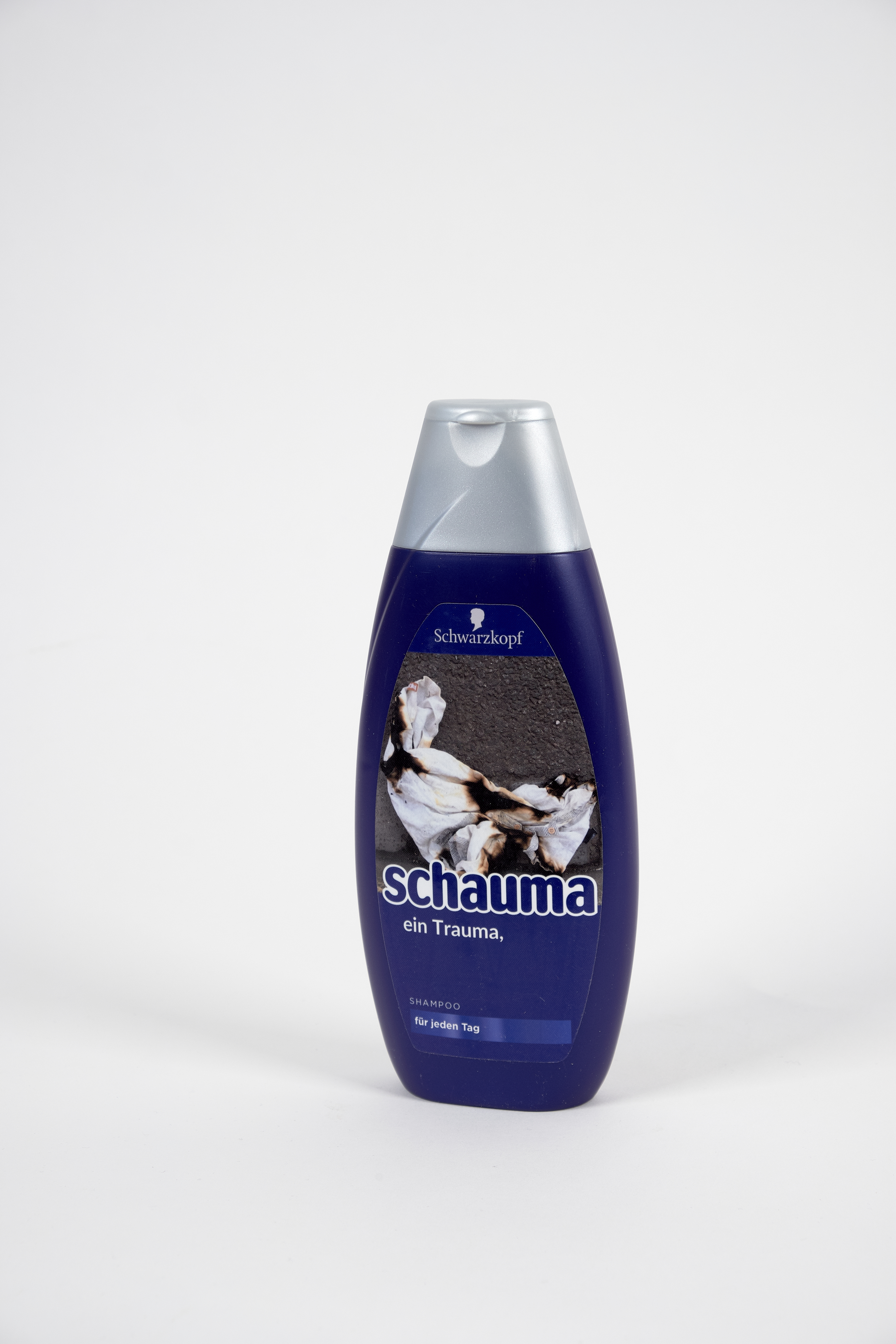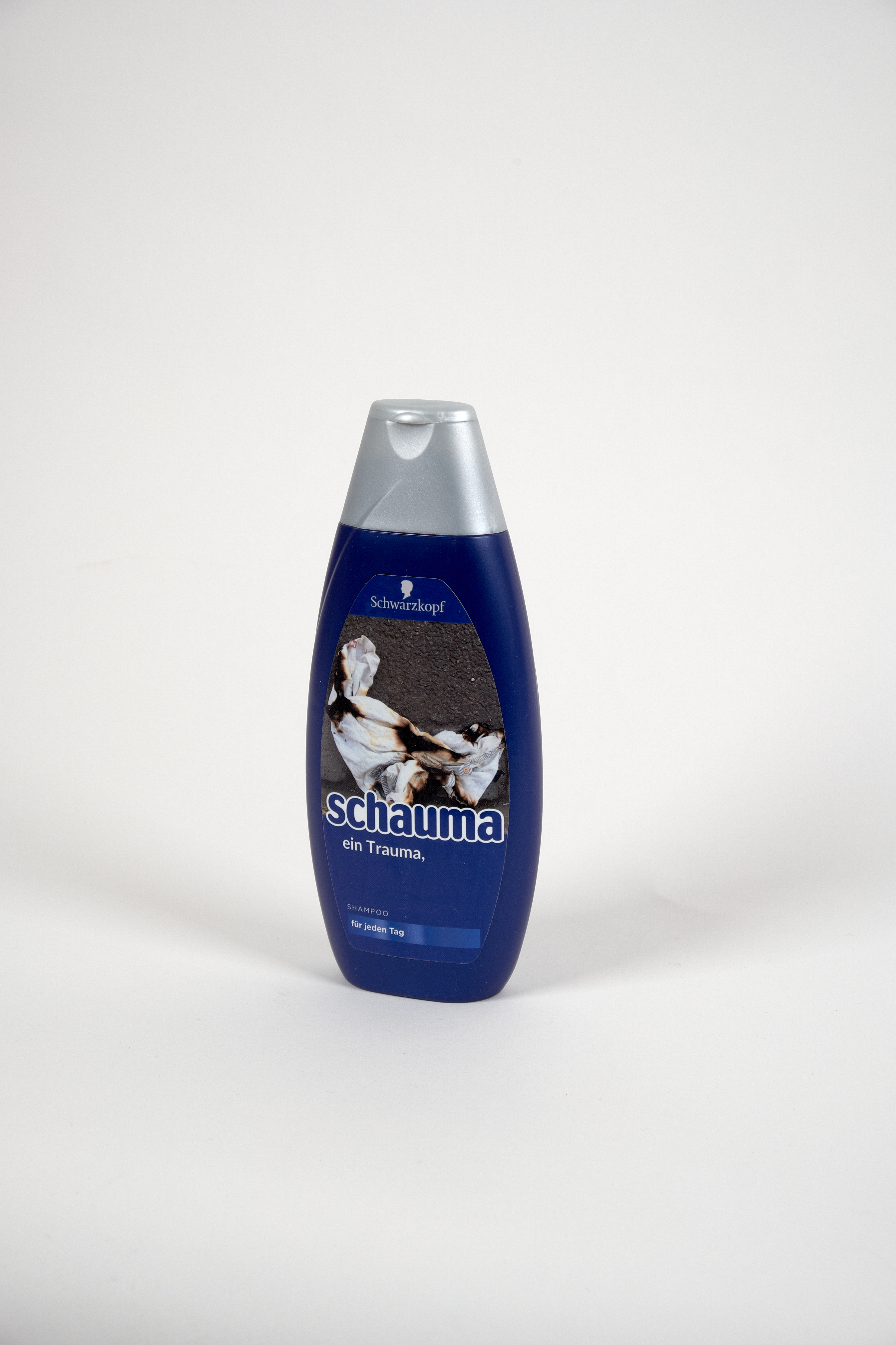 Die Arbeit zeigt eine handelsübliche Shampooflasche, deren Etikett individualisiert wurde. Statt einer lachenden, heterosexuellen Kleinfamilie mit überweißen Zähnen und Schaum im Haar findet sich der Umriss einer versehrten Person mit abgeänderter Botschaft. Wie würde es sich anfühlen, durch eine Drogerie zu laufen mit Produkten, die unserer emotionalen Realität entsprechen?